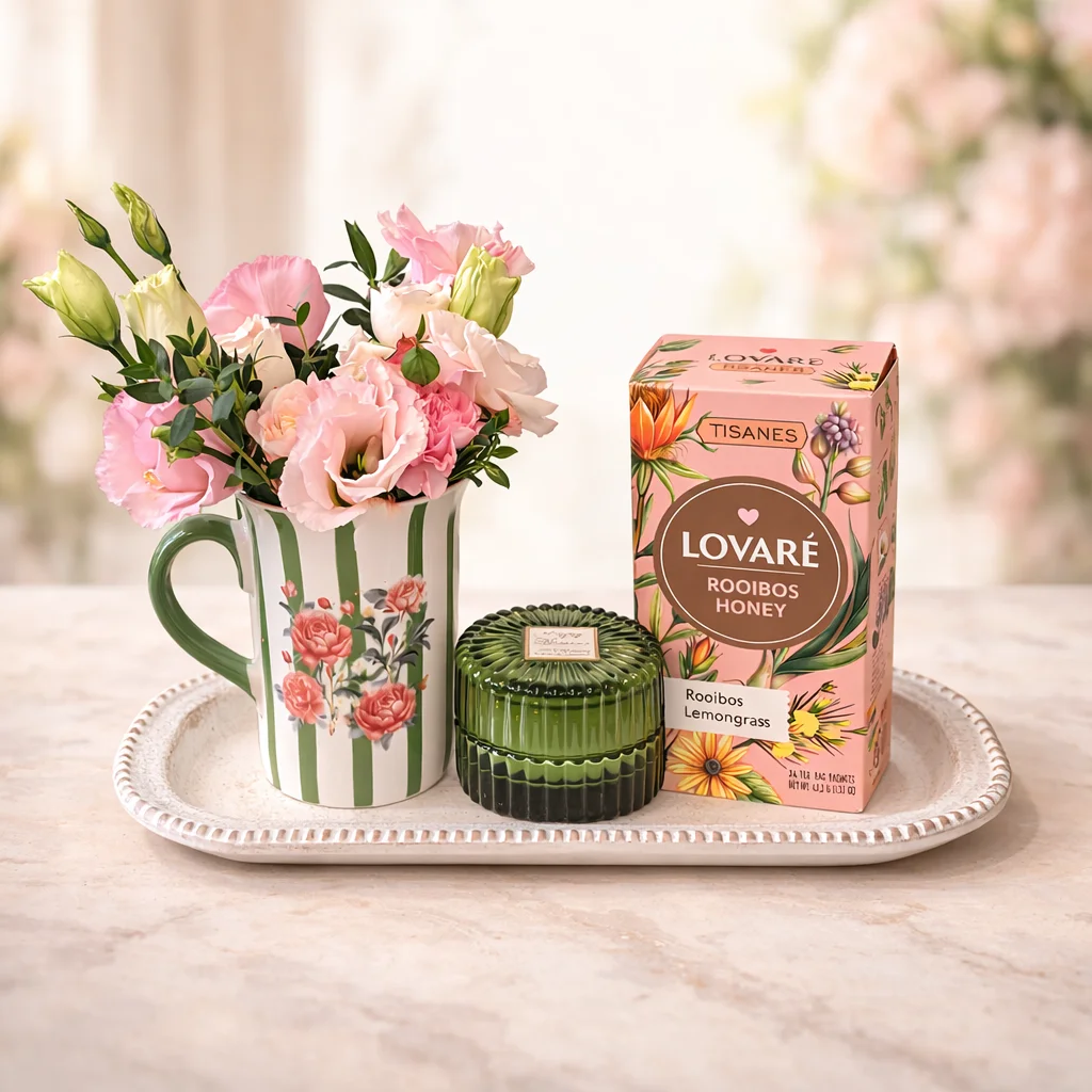 Set cadou elegant cu cană florală, lumânare parfumată și ceai Lovaré Rooibos Honey & Lemongrass – perfect pentru relaxare sau un cadou rafinat. 🌸