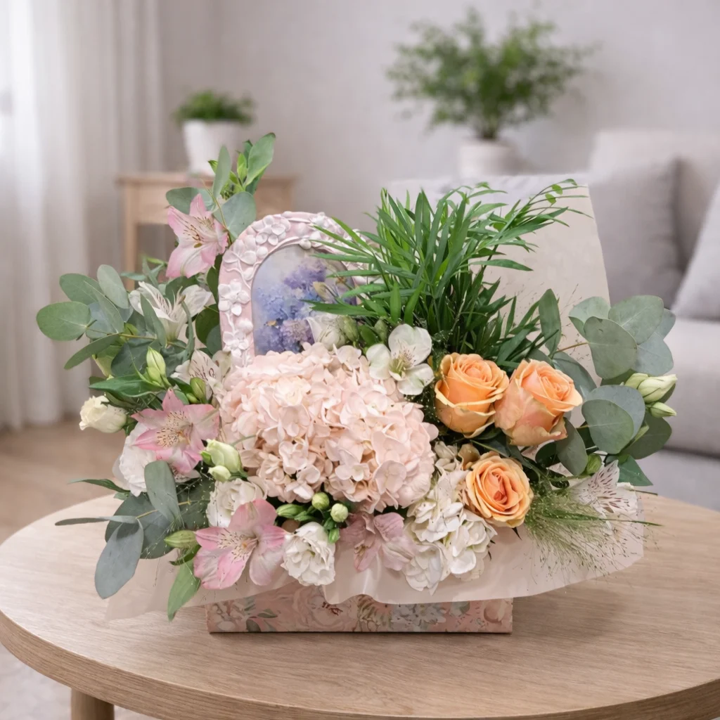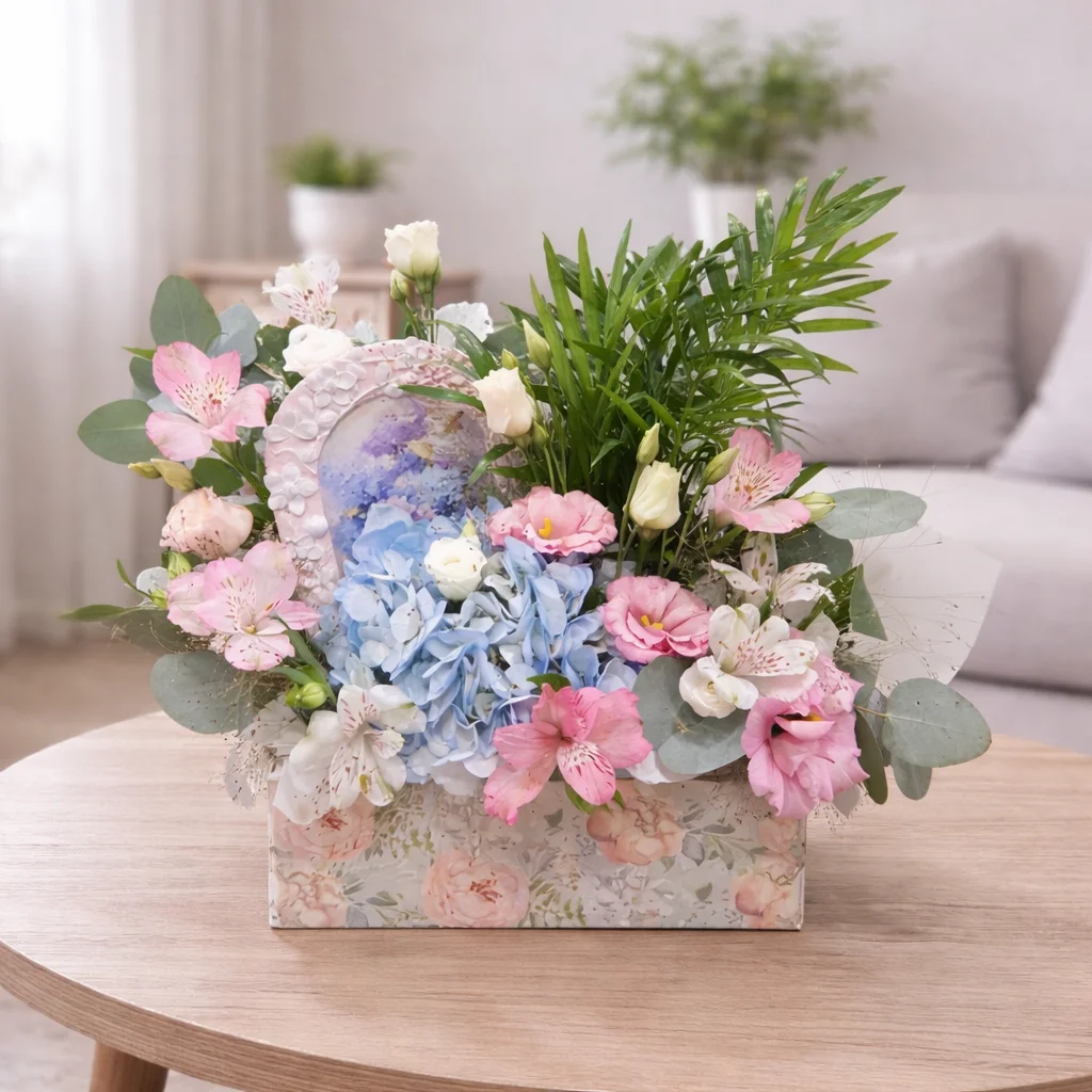 Acest aranjament floral elegant în cufăr este o combinație armonioasă de flori delicate și texturi naturale, creat pentru a transmite rafinament și prospețime. Aranjamentul îmbină flori pastelate, fine și accente bogate de verdeață naturală, precum și o ramă foto deosebită, pentru a oferi o surpriză neașteptată destinatarului.