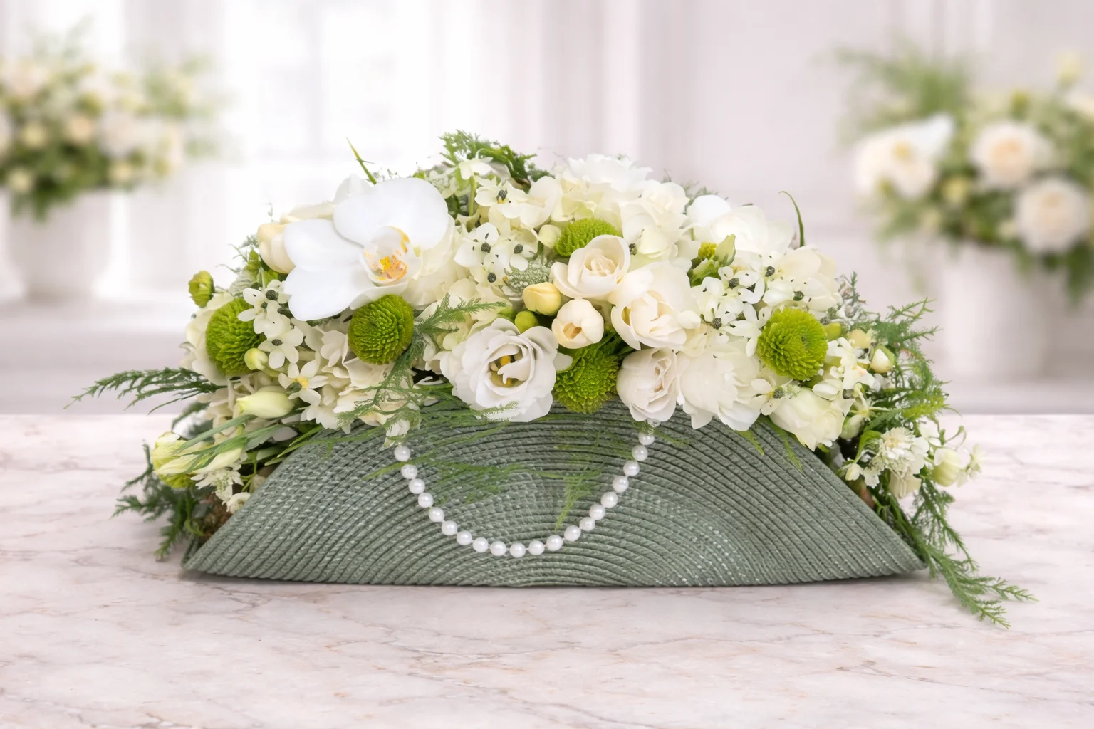 Aranjamentul floral White Elegance este expresia pură a rafinamentului și bunului gust. Creat într-un suport decorativ tip poșetă, în nuanțe naturale, acest aranjament impresionează prin combinația armonioasă de flori albe delicate și accente verzi proaspete, atent alese pentru un efect sofisticat.