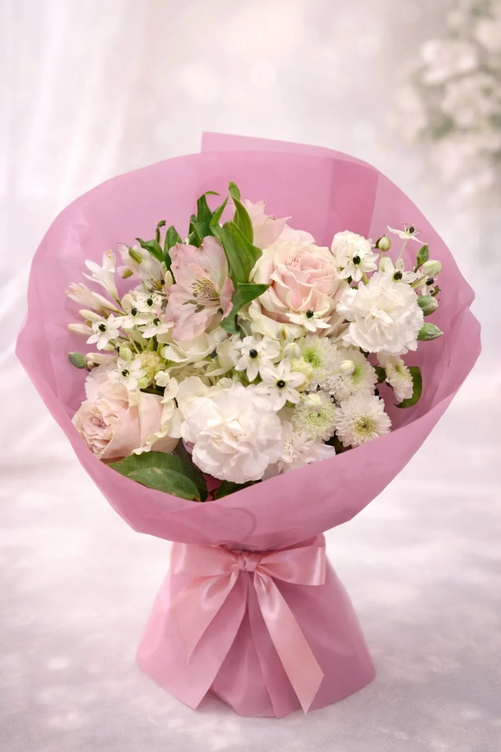 Ambalat într-o hârtie pastelată fină, cu o fundiță elegantă, acest buchet este alegerea perfectă pentru momente speciale în care simplitatea și bunul gust spun totul.