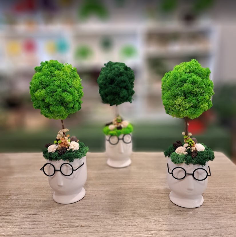 Copăcelul este realizat manual din licheni stabilizați, accesorizat cu flori și verdeață artificiale.