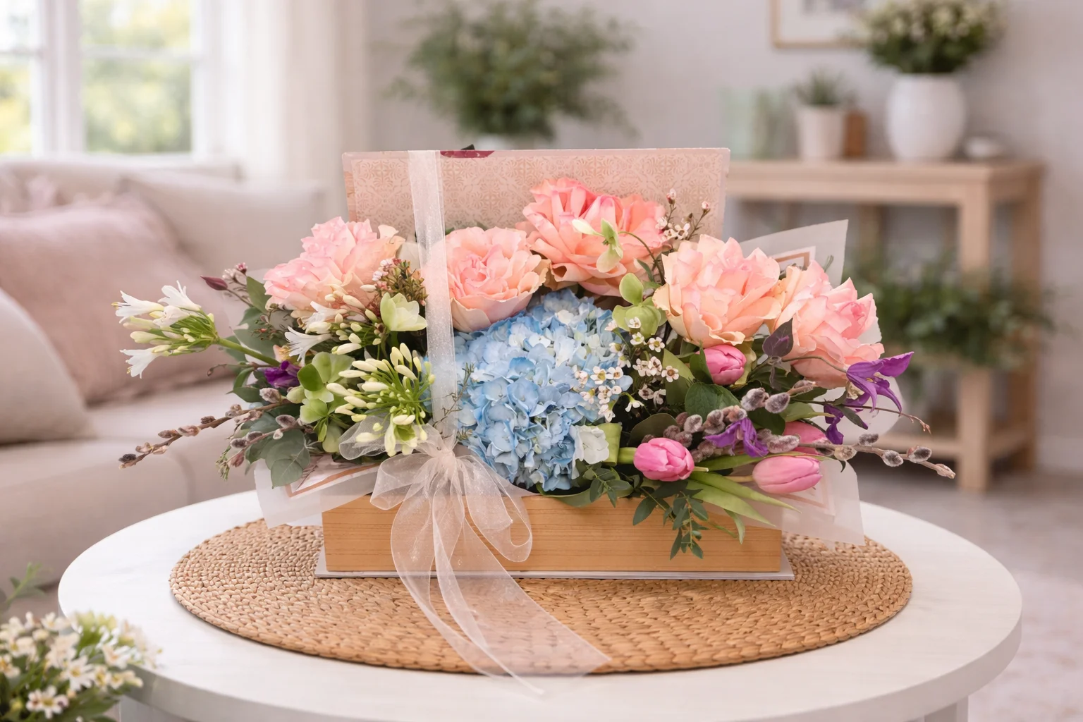 Acest aranjament floral elegant este o compoziție rafinată, creată pentru a impresiona prin delicatețe și echilibru cromatic. Realizat într-o cutie tip carte, aranjamentul combină armonios hortensie albastră spectaculoasă, trandafiri roz pudrat, lalele roz, flori albe fine și accente de verdeață naturală, rezultând un design bogat, dar aerisit.