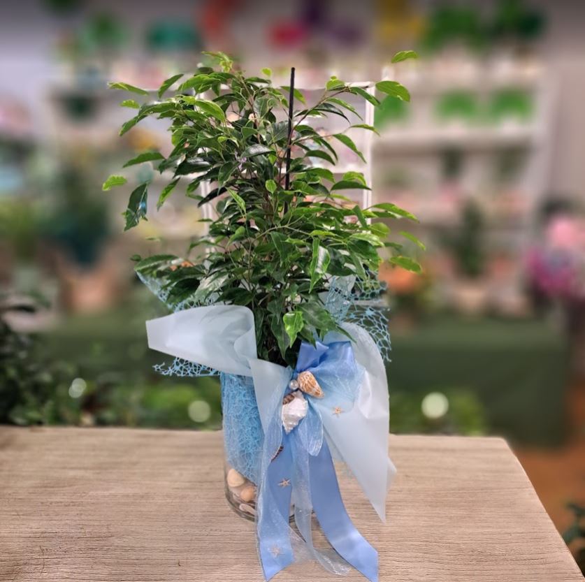Ficus Benjamina – plantă la ghiveci H 35 cm, în cilindru de sticla, diam.15 cm 60 cm, H total 60 cm.