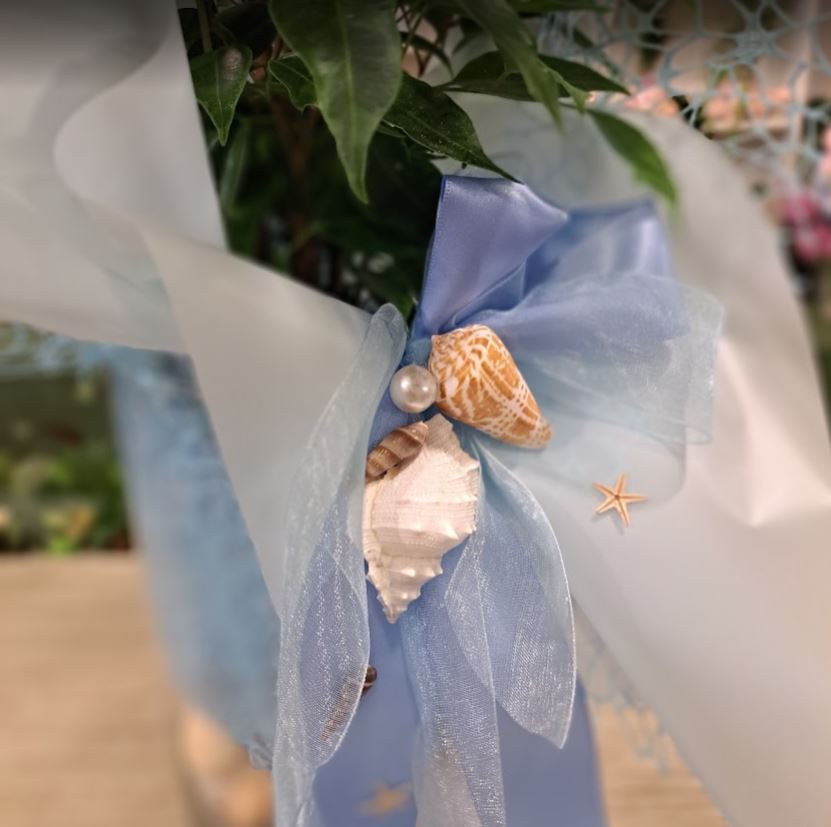 Aranjamentul este accesorizat cu decoratiuni in tematica marina, fiind un cadou menit sa aduca atmosfera estivala in sufletul celor care il primesc, dar si in acelora care il daruiesc.