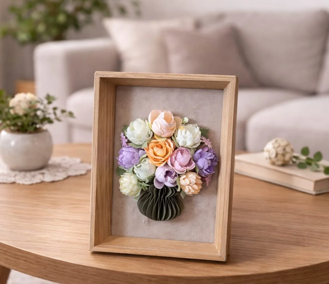 TAbLOU FLORAL DECORATIV „Buchet Pastel în Ramă de Lemn”